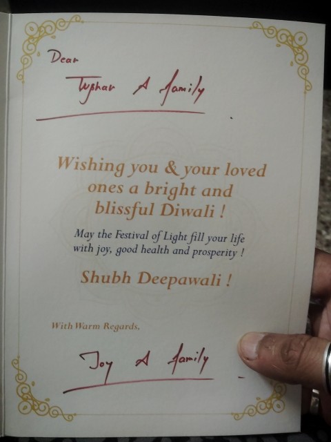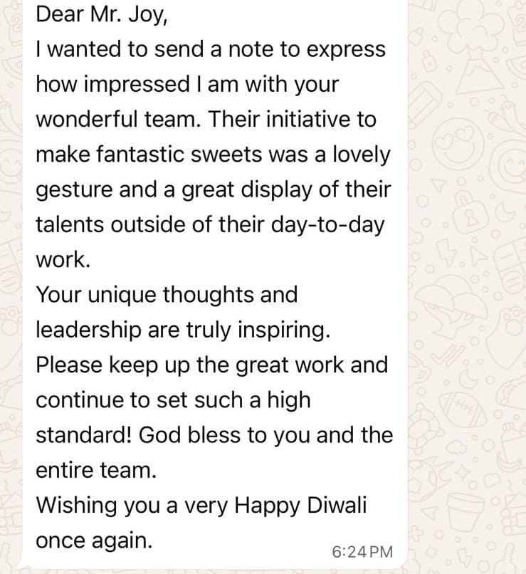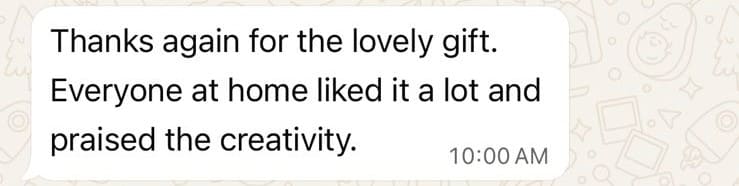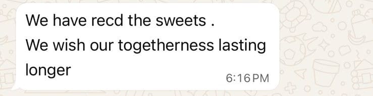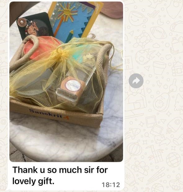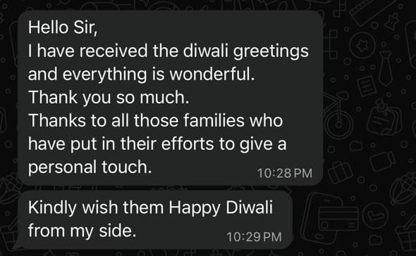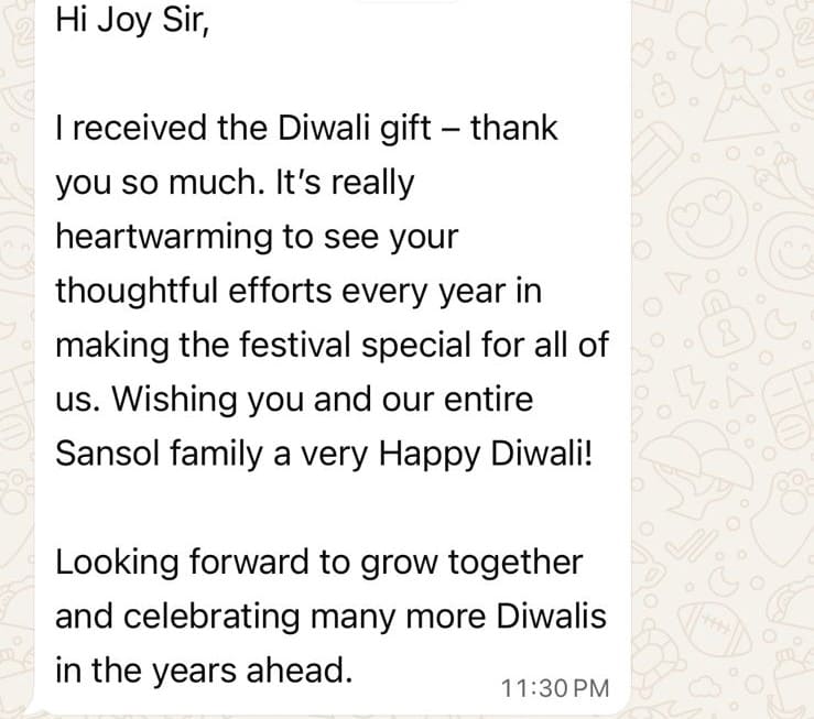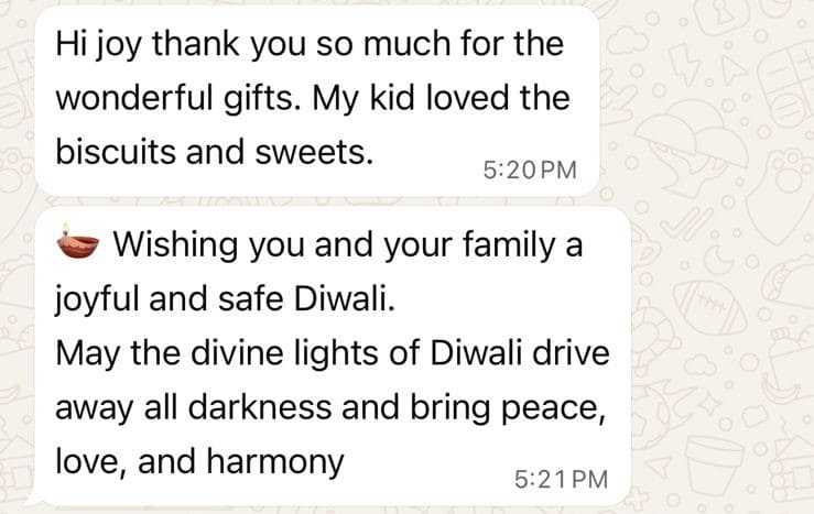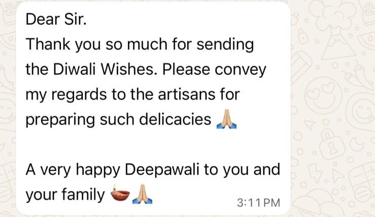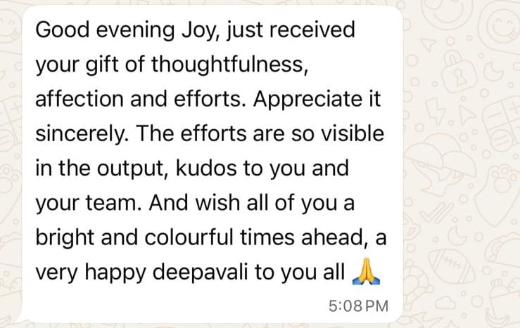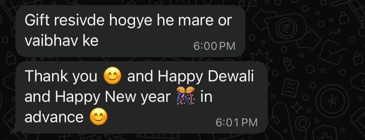 "It was nice to receive the gift, it adds to the joy of Diwali. Thanks to your team.
